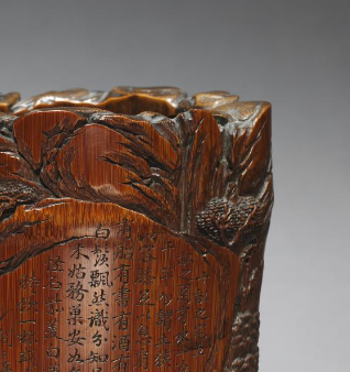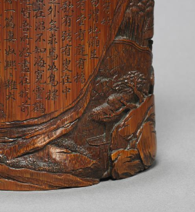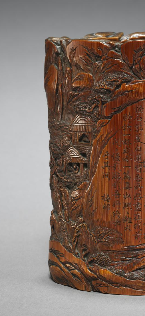 本品规格为16 x 12.4 厘米。以竹为材,保留天然竹节形态。通体施雕刻工艺,一面呈现山水图景,山峦、树木、屋舍错落,营造出清幽意境;另一面刻有诗文,字体古朴。雕刻细腻,层次丰富,将山水之韵与人文气息融合,兼具实用与艺术价值,尽显清代竹雕工艺精湛,是文房雅器,承载当时文人审美与技艺 。