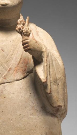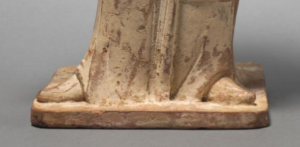 本品规格为43.8 x 16.5 x 12.2 厘米。梳双髻,发型规整,展现唐代女性发髻特点,面庞丰腴圆润,是唐代以胖为美的审美体现,眉眼、唇部等虽彩绘多剥落,但仍可感知面部神态,似含平和笑意 。身着宽袖长袍,衣纹线条流畅自然,生动呈现衣物的褶皱形态,能体现唐代服饰的飘逸质感;腰部有系带设计,增添造型层次,部分彩绘残迹可辨衣饰曾有的色彩装饰 。右手持花,花朵造型小巧,细节虽因岁月有损,但仍可看出持花姿态优雅;左手自然下垂,手部造型简洁,与整体风格协调 。