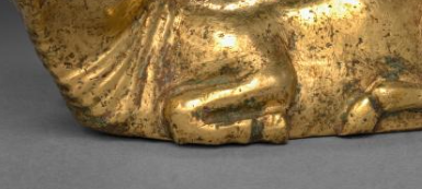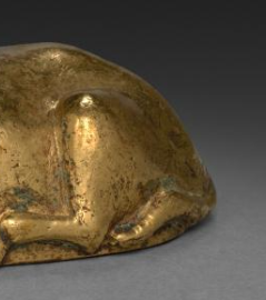 本品规格为3.5 x 7 厘米。牛呈卧姿,体态敦实,四肢收拢于身侧,牛角弯翘,双目圆睁, 口鼻线条简洁,生动呈现牛的温顺与憨态,整体造型写实且富有神韵。采用鎏金工艺,金色镀层虽历经岁月,仍有部分留存, 金属光泽古朴厚重,表面细微斑驳,见证岁月痕迹,凸显唐代金属加工与鎏金技艺的高超。