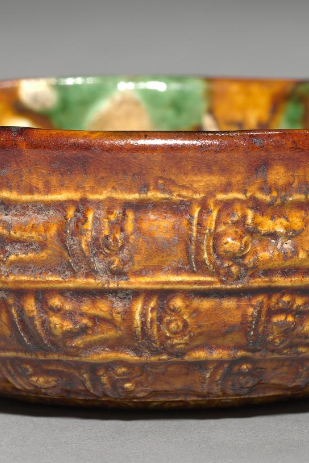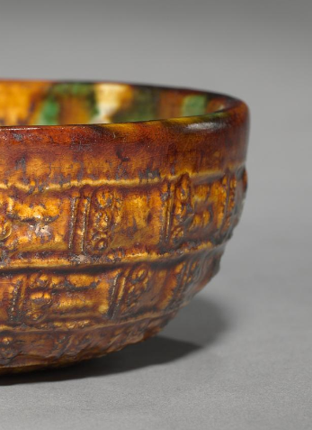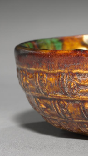 本品规格为直径10.1厘米,高度3.9厘米。造型为经典的圆形碗体,器型规整。胎体施三彩釉,外壁以棕褐为主色调,通过模印工艺呈现出多层连续的贴花纹饰,图案古朴,具立体层次感;内壁则有绿、黄等色釉,色彩交融自然,虽历经岁月,仍保留唐代三彩独特的古朴韵味与工艺特征,是唐代三彩陶瓷艺术的典型代表,反映当时制陶技艺水平与审美风格 。