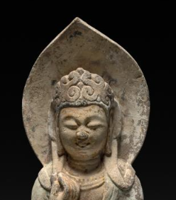 本品规格为40.2厘米。以石材雕琢而成,历经岁月仍留存古朴韵味。菩萨头戴宝冠,冠饰精美;身后有舟形背光,增添神圣感。面部线条柔和,神态安详。身着长袍,衣纹流畅自然,右手施无畏印,左手持物(部分细节因岁月有磨损)。整体造型端庄,工艺精湛,展现唐代佛教造像的艺术风格,是研究唐代宗教雕刻艺术的重要实物 。