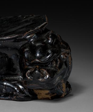 本品规格为13 x 30 厘米。以瓷为质,施黑釉,釉面有自然流淌痕迹。造型独特,将人物与瑞兽融合,人物形态生动,瑞兽雕刻细腻,枕面呈弧形。整体古朴厚重,黑釉温润,工艺精湛,兼具实用与艺术价值,展现元代瓷塑艺术风格,是研究元代陶瓷、生活器具的实物,承载当时审美与技艺 。