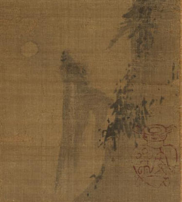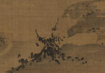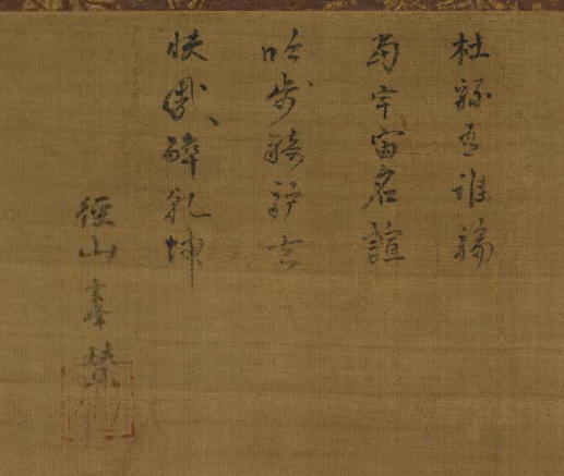 本品规格为54.3 x 36 厘米。以绢本为底,呈现典型元代山水意境。画面布局简洁空灵,远山以淡墨轻染,轮廓隐现,营造出悠远朦胧之感;近景坡岸、草木用笔简练,寥寥数笔勾勒形态,展现自然野趣。上方有行书题字,落款 “径山書珪”,字体与山水意境相融,体现元代书画诗一体的文人风格,虽笔触简约,却传递出静谧悠远的山水神韵,是研究元代文人画审美与技法的实物,见证当时 “逸笔草草,不求形似” 的艺术追求 。