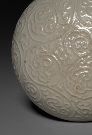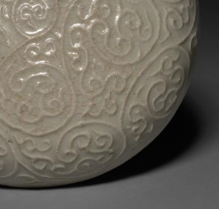 整体呈浑圆状,由盖与盒身扣合而成。通体施青白釉,釉色温润,质感淡雅。盒盖面以印花工艺满饰云纹,云纹卷曲灵动,排列规整,经模印后呈现出清晰的凹凸立体感,尽显元代制瓷工艺特色。此圆盒小巧精致,印花装饰细腻,既具实用收纳功能(可存小物),又因青白釉与云纹之美,成艺术珍品,反映元代瓷器对纹饰与造型美感的追求,是研究元代陶瓷装饰与工艺的典型器物 。