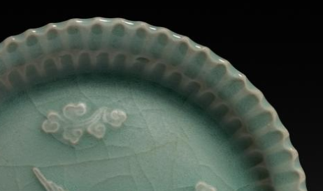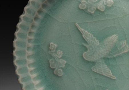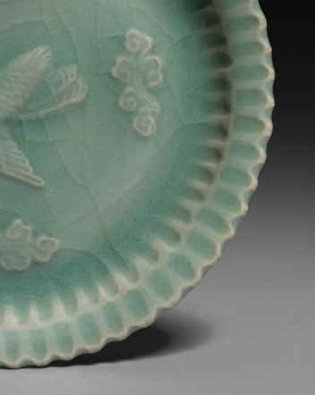 元代青釉贴塑云鹤纹菊瓣盘