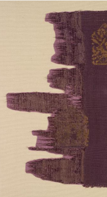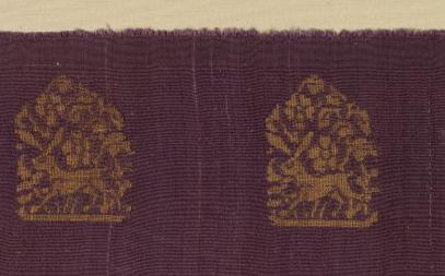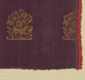 本品规格为26 x 42.8 厘米。以紫色丝线为地,金线(片金或圆金 )织纹,呈现 “金紫相辉” 的视觉效果,符合元代 “织金尚繁” 的工艺特色 —— 蒙古游牧文化对贵金属的崇尚,与中原丝织技艺深度融合。瑞兽纹生动(兽首、肢体细节清晰 ),团窠边缘辅以卷草纹,整体 “繁而有序”,传递 “祥瑞守护” 的寓意(瑞兽象征权威、驱邪 )。图案以 “团窠”(近似梯形的窠格 )为单元,内织瑞兽(或为狮子、天马 ),窠格排列规整,体现元代 “纹饰尚规” 的设计逻辑 —— 继承唐宋团花传统,融入游牧民族对瑞兽的崇拜。