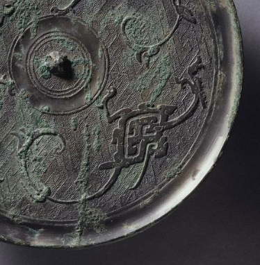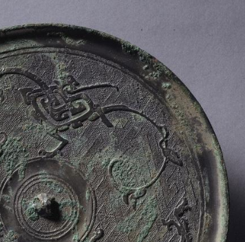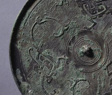 本品规格为直径16.9厘米,厚度0.6厘米。呈圆形,因岁月侵蚀,表面覆有斑驳绿锈,间杂青铜原色,古朴厚重,尽显历史沧桑。中央设小圆钮,用于手持、悬挂,钮周环绕同心圆纹,规整简洁,为布局定基调。主纹以变形凤鸟纹为核心,凤鸟形态经艺术变形,线条蜿蜒、灵动,似在镜背穿梭;周围辅以其他装饰纹,与变形凤鸟纹呼应,构建出对称且富有动感的图案,展现战国工匠高超技艺。