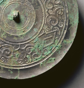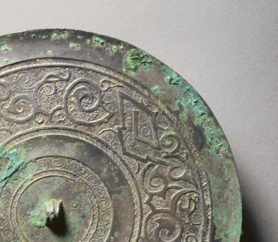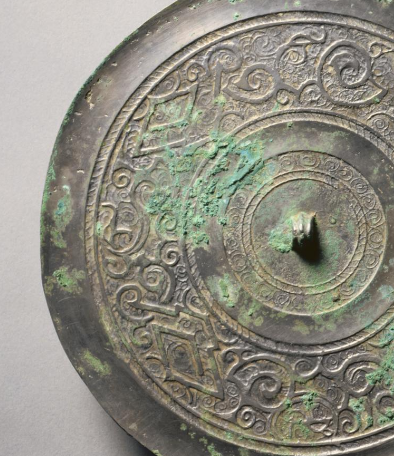 本品规格为直径17.9厘米,厚度0.9厘米。圆形,中央设弦纹钮(便于悬挂、手持),镜背以 “菱形 + 蟠螭纹” 为核心装饰,分多层布局,遵循战国铜镜 “圆钮、满工饰” 的经典设计,实用与审美融合。菱形纹作间隔,蟠螭纹缠绕其间,线条细密、连环卷曲,构成对称且富有动感的图案。菱形象征秩序,蟠螭纹寓意祥瑞,体现战国纹饰 “繁缛神秘” 的风格,反映对神灵、自然的崇拜。