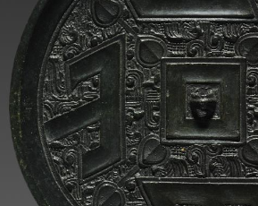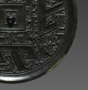 本品规格为直径10.4厘米。整体呈圆形,色泽黑亮,尽显古朴厚重。镜背中央设方形钮座,其上有小钮,用于手持或悬挂。围绕钮座,分布着四个 “山” 字纹,造型醒目,线条硬朗。“山” 字间以细密的地纹填充,或为云雷等图案,层次丰富。纹饰铸造精细,虽历经千年,仍纹理清晰,展现战国铜镜独特工艺,是研究当时审美与铸造技术的重要实物,见证战国时期的艺术风格与文化内涵。