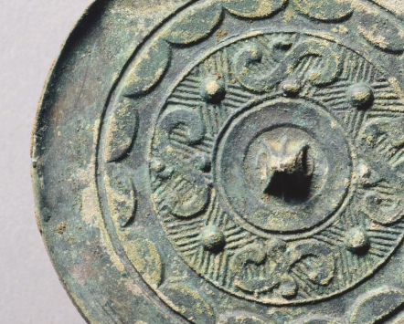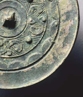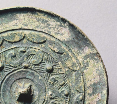 本品规格为直径8.5厘米。圆形,中央设三弦钮(便于穿绳悬挂、手持),外区环绕连弧纹(多为内向连弧,装饰边缘),遵循战国铜镜 “圆钮、满工饰” 的经典设计,实用与审美融合。以星云纹为主体,乳钉纹作间隔,线条卷曲如星云散布,构成对称且富有动感的图案(体现战国纹饰 “繁缛神秘” 的风格)。星云纹象征宇宙天象,乳钉寓意繁星,反映当时对 “天圆” 观念与自然(天象)的崇拜。