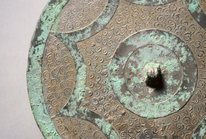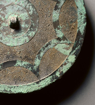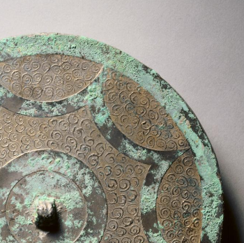 本品规格为直径23.7厘米,厚度1.2厘米。呈圆形,因岁月侵蚀,表面覆有斑驳绿锈,间杂青铜原色,古朴厚重,尽显历史沧桑。中央设小圆钮,用于手持、悬挂,钮周环绕同心圆纹,规整简洁,为布局定基调。主纹以云雷纹为主,线条细密回旋,似层层云气、滚滚雷声,富有韵律;连弧纹呈花瓣状向外伸展,与云雷纹交织,刚柔并济。两种纹饰相互映衬,构建出对称且富有动感的图案,展现战国工匠高超技艺。
