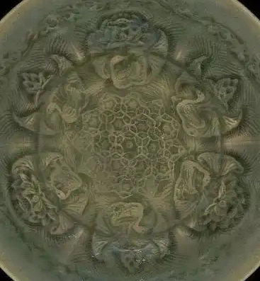 纹饰特点:盘面刻有精美的花纹,是这件文物的最大亮点。纹饰布局严谨且富有层次感,中心部分可能是花卉纹,如牡丹、菊花等,花朵刻画得饱满、生动,花瓣舒展,花蕊细节丰富;花卉周围辅以卷草纹、云纹等辅助纹饰,增强了画面的动感和韵律感。从边缘向中心,纹饰呈现出一种向心式的分布,主次分明。刻纹线条刚劲有力,刀法犀利,体现出北宋耀州窑工匠高超的刻花技艺,花纹部分由于剔刻较深,与青釉底色形成鲜明对比,立体感十足。