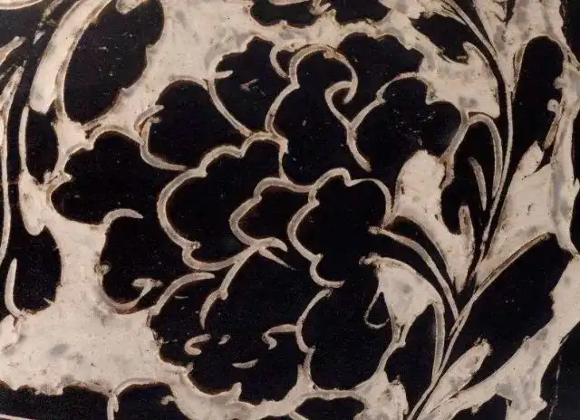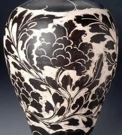 纹饰特点:瓶身最突出的装饰是采用剔花工艺呈现的牡丹纹。先在坯体上施一层黑色釉料,然后用工具剔除花纹轮廓以外的黑釉,露出下层的胎体,形成黑白对比强烈的装饰效果。牡丹纹刻画得极为生动,花朵硕大,花瓣层次分明,舒展饱满,尽显牡丹的雍容华贵;花蕊、花枝和叶子的细节也处理得十分精细,叶脉清晰,展现出工匠高超的技艺。除牡丹纹外,瓶身可能还装饰有一些辅助纹饰,如卷草纹等,增强了画面的动感和层次感。