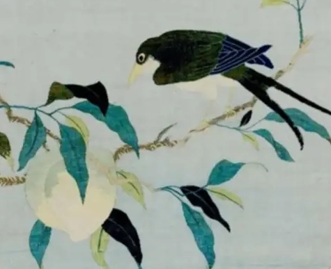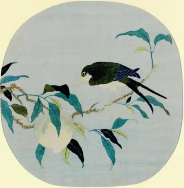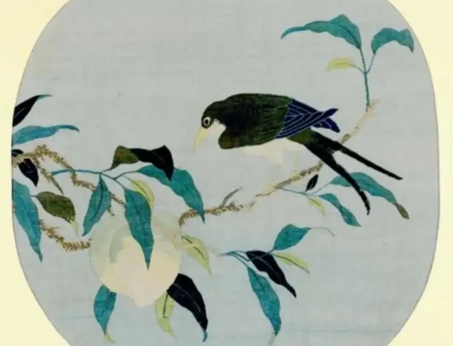 画面内容:画面主体是一只鸟栖息在桃枝上。鸟儿羽毛色彩丰富,通过不同颜色的丝线缂织而成,头部、背部羽毛呈现出深绿与蓝黑交织的色泽,腹部羽毛洁白,眼睛圆睁,神态灵动。桃枝上还有翠绿的叶子,叶片形态自然,叶脉清晰可见,通过缂丝工艺细腻地表现出叶子的质感和层次感。此外,桃枝上还能看到一个圆润饱满的桃子,呈现出淡淡的白色,与枝叶、鸟儿相互映衬,营造出和谐美好的画面氛围。