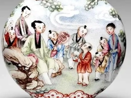 画面内容:壶身绘有人物园林场景,人物形象生动鲜活,穿着清代典型的服饰,发型、配饰等细节都刻画入微。人物之间的互动自然,或交谈,或嬉戏,展现出一幅其乐融融的生活画面。园林场景中的树木、山石、亭台楼阁等元素布局合理,通过细腻的笔触和丰富的色彩表现出园林的清幽雅致。此外,在壶身的颈部和底部边缘,还装饰有精美的花纹图案,如回纹、如意纹等,增添了鼻烟壶的华丽感。