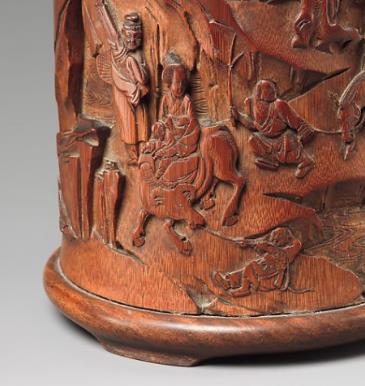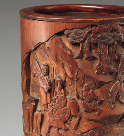 文人直接参与竹雕创作或定制:一方面,文人将自己的审美偏好(如对历史典故的喜爱、对 “清雅” 风格的追求)融入笔筒设计,要求工匠雕刻符合文人审美的题材与风格;另一方面,部分文人本身就是竹雕高手(如金农、郑板桥等),他们亲自操刀,将书法、绘画技巧融入雕刻,使竹雕从 “工匠技艺” 升华为 “文人艺术”,推动了人物故事题材的流行(相比花鸟、山水,人物故事更能承载文化寓意)。