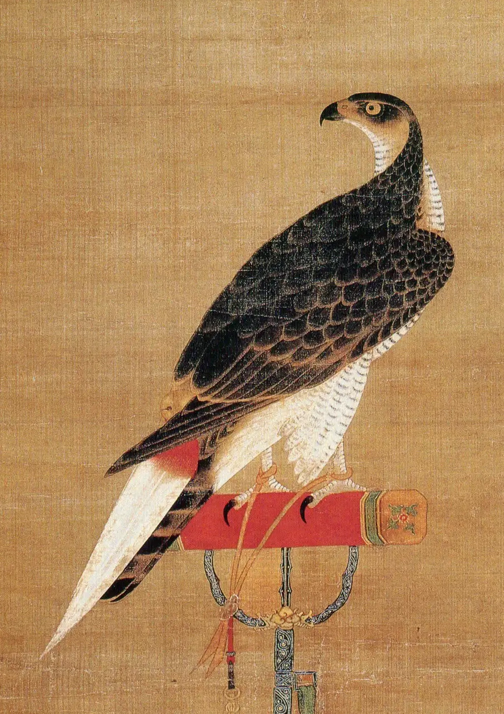 元代的花鸟画风格多样,既有继承宋代工笔重彩的细致风格,也有受文人画影响的写意风格。鹰在传统文化中象征着勇猛、力量和自由,常常成为画家笔下的题材。徐泽的《架上鹰图》体现了元代花鸟画注重写实,对描绘对象进行细致入微刻画的特点,同时也反映了当时社会文化中对猛禽所代表的精神品质的崇尚,是研究元代花鸟画发展和文化内涵的重要实物资料。