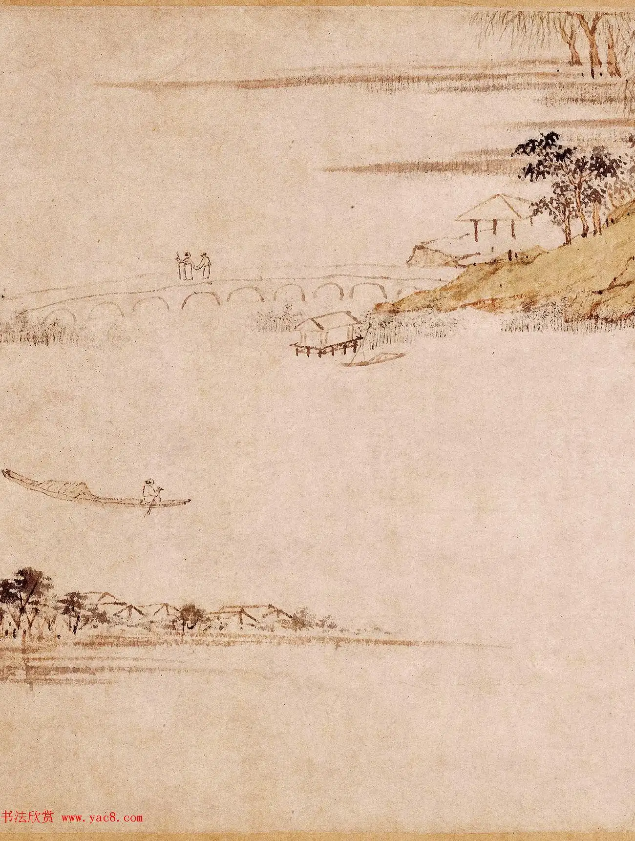 画面内容:描绘了石湖周边的自然风光与人文景致。远处山峦连绵,以淡墨轻染,展现出山的朦胧与悠远;近处湖水平静,偶有渔舟划过,渔夫或悠然垂钓,或摇桨前行,充满生活气息。岸边树木葱郁,形态各异,有的枝叶繁茂,有的则是枯树立于岸边,增添了画面的层次感。还描绘了几座桥梁,桥上有人往来,刻画虽简却生动地展现出人物的动态。此外,还能看到几处房舍,或隐于林间,或临湖而建,体现出人与自然和谐共处的景象。