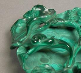 笔舔主体采用天然孔雀石雕琢而成。孔雀石作为一种含铜碳酸盐矿物,其典型特征是呈现深浅交错的翠绿至艳绿色条纹,纹理如流水、云雾般自然蜿蜒,且每件原料的纹路均独一无二 —— 清代工匠在选材时尤为注重保留这种 “天然肌理”,使笔舔的底色自带 “活色生香” 的视觉效果,无需额外施色便尽显华贵。此外,优质孔雀石质地致密细腻,硬度适中(莫氏硬度 3.5-4),既便于精细雕刻,又能在使用时温和承接墨汁,避免损伤毛笔毫毛,兼具 “颜值” 与实用性。