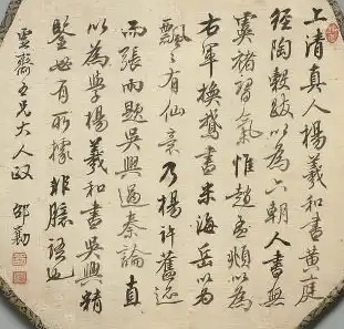 在这样的文化背景下,书法成为文人雅士之间重要的交流方式和艺术表现形式。团扇作为一种传统的文化载体,常被用来展示书法作品,无论是宫廷还是民间,都有在团扇上题字作画的风气。文人墨客们通过在团扇上书写诗词、文章或对艺术的见解,不仅展现了自己的书法技艺,也传递了文化内涵和审美情趣,这件书法异形团扇正是清代书法艺术与传统工艺品结合的产物,反映了当时的文化艺术氛围和社会风尚。