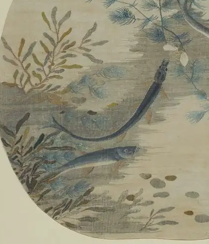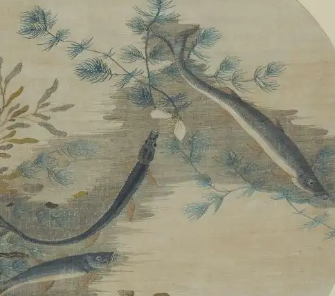 绘画技法:运用细腻的线条勾勒鱼和水草的轮廓,线条流畅且富有变化,展现出画家扎实的功底。墨色和色彩的运用上,浓淡相宜,通过色彩的深浅变化表现出物体的立体感和空间感。例如,用淡色表现远处的水草和石头,用相对浓重的色彩描绘近处的鱼,使画面层次分明。因年代久远,绢本呈现出自然的陈旧色泽,有轻微的磨损和褪色痕迹,但画面的笔墨神韵依然较为清晰。