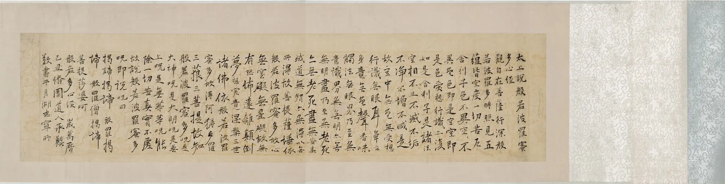 画面内容:画卷以长卷形式展开,描绘了姨母育佛的场景。画面中人物众多,神态各异,身份明确。姨母居于重要位置,神态慈祥而庄重,举止间透露出对佛的虔诚与呵护 。周围有侍女、僧人等人物,他们或侍奉左右,或虔诚礼拜,通过细腻的表情和动作刻画,展现出不同人物的心理状态和情感。场景布置丰富,有华丽的帷幔、精美的器物,体现出当时的生活场景和装饰风格。画面右侧可能还绘有与佛教相关的器物或象征元素,增强了宗教氛围。
