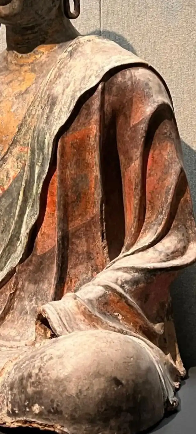 材质与色泽:以夹纻工艺制成,胎体轻盈且坚固。表面的漆层历经岁月,虽有部分剥落,但仍能看出曾经的绚丽。原本的彩绘色彩丰富,如肌肤处可能为肉色,袈裟处有多种颜色,虽已斑驳,但仍能分辨出红、绿等色彩。涂金部分也有磨损,不过在一些凸起和关键部位,仍闪烁着金色光芒,为佛像增添了华贵庄严的气质。