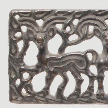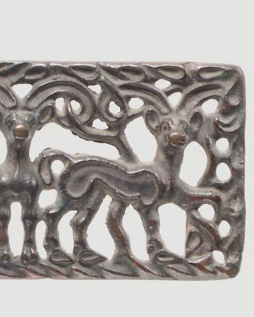 采用汉代成熟的 “镂空透雕”(又称 “镂雕”“透雕”),先在青铜板材上勾勒出羊纹轮廓,再通过錾刻、镂空、打磨等步骤,去除纹饰外的多余铜料,使羊纹与背景形成 “虚实相生” 的立体效果 —— 羊的身躯、四肢为 “实”,背景的镂空区域为 “虚”,既减轻了带板重量,又让纹饰更显灵动,避免了平面雕刻的单调。部分细节(如羊的毛发、面部)可能辅以 “线刻”,用细劲的阴刻线刻画羊的眼睛、胡须、卷曲的羊毛,线条流畅且富有韵律,体现汉代 “简约而不简单” 的审美取向。
