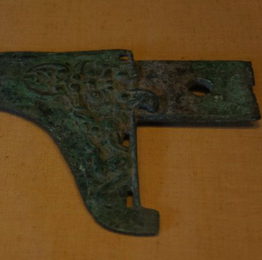 汉代是中国历史上一个强盛的朝代,在军事方面有着完备的军备体系。戈是一种传统的长兵器,在汉代以前就已经广泛使用,虽然在汉代随着骑兵的兴起,戟、矛等兵器逐渐成为战场上的主流,但戈在礼仪活动、车战遗迹一些特定的军事场合仍在使用。同时,汉代的青铜铸造工艺在前代基础上不断发展, 不仅用于制造兵器,还用于制作各种礼器、生活用具等。青铜器物上的纹饰也从商代、西周时期的神秘威严,逐渐向更加流畅、富有动感的风格转变,这件汉戈上的纹饰就是汉代青铜艺术风格的一种体现。