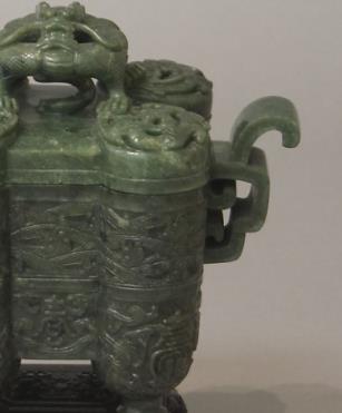乾隆皇帝重视新疆的管辖,通过平定准噶尔叛乱、加强对和田地区的控制,确保了和田玉料的稳定供应;同时,宫廷还通过 “朝贡”“采买” 获取俄罗斯、中亚等地的优质碧玉,解决了 “原料短缺” 问题,为大型玉雕器物(如四联瓶)的制作奠定基础;此类四联瓶并非实用器(因 “四联” 结构,无法单独盛装液体),而是纯粹的 “宫廷陈设器”,主要摆放于养心殿、宁寿宫、御花园等皇帝日常活动场所,或作为 “赏赐品”(赏赐给王公贵族、外国使节),彰显皇家威严与财富。