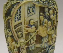 以椭圆形为主高度多在 6-10 厘米之间,宽度 3-5 厘米,厚度 2-3 厘米,符合成人手掌握持尺寸必备 “壶口”“壶颈”“壶腹”“壶盖” 四部分 —— 壶口极小(直径仅 0.5-1 厘米),需搭配 “小勺”(多为象牙或金属制,藏于壶盖内)取用鼻烟;壶颈短而细,部分雕刻弦纹或回纹装饰;壶腹为主要雕刻区域,空间开阔;壶盖多为 “平顶” 或 “圆顶”,部分镶嵌 “碧玺”“珊瑚” 等宝石作为钮,既提升美观度,又方便开启。