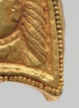 整体呈长条形,前宽后窄,周缘有钉孔,可能是剑鞘的装饰。金饰片上的人物穿着吐蕃翻领袍,束发额带,后飘绶带吐蕃的金饰工艺以其美观、珍奇以及精良的工艺著称于世