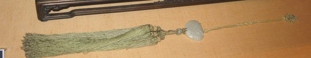 材质与色泽:主体部分由玉制成,玉质温润细腻,呈现出柔和的白色,局部带有褐色的沁色,增添了古朴之感。木质底座色泽深沉,与玉如意形成鲜明对比,更凸显出玉的温润。流苏的丝线颜色淡雅,玉石圆珠则与玉如意的色泽相呼应。