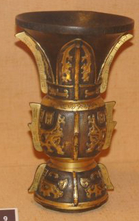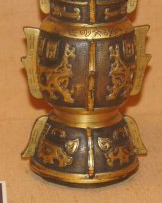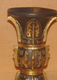 材质与色泽:主体材质为青铜,历经岁月,表面呈现出深沉的青黑色,带有历史的厚重感。器物上有嵌金装饰,金色与青铜的青黑色形成鲜明对比,显得格外华丽。虽然部分金饰可能因时间久远有磨损,但仍能看出其曾经的精美。