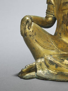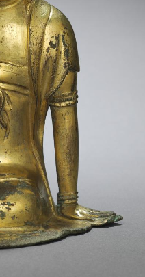 本品规格为17.6厘米。观音呈 “自在坐”(游戏坐 ),左腿曲盘、右腿下垂,右手搭于右膝,左手撑地,姿态闲适洒脱,突破传统佛造像的庄严拘谨,体现北宋造像对 “自在” 神韵的追求,契合文人雅士审美与宗教世俗化趋势。以铜为胎,通体鎏金(虽有部分剥落,仍显华贵 )。头戴宝冠,冠型简洁;面部线条柔和,眉眼低垂、嘴角微扬,流露慈悲宁静;衣饰刻画细腻,袈裟褶皱自然,胸前系带、袖口纹饰清晰,尽显北宋造像工艺精湛。
