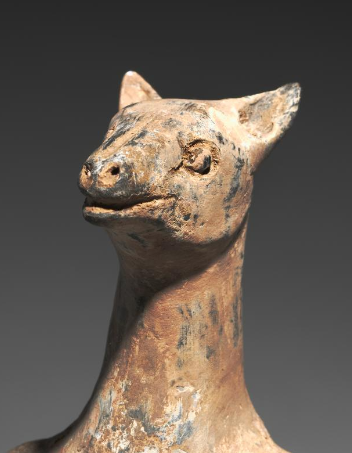 本品规格为22.6厘米。头部为狗首,双耳竖起,透着机敏,双眼圆睁,炯炯有神,似乎在警惕地观察周围 ,嘴巴微微张开,展现出狗忠诚且警觉的神态。尽管历经岁月侵蚀,狗首的特征依然清晰可辨,生动地还原了狗的形象特点。以陶土烧制而成,岁月在其表面留下斑驳痕迹,呈现出古朴的色调,主要为灰黑色,并夹杂着棕褐色的锈迹与风化痕迹 ,尽显历史的沧桑厚重感。
