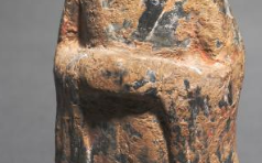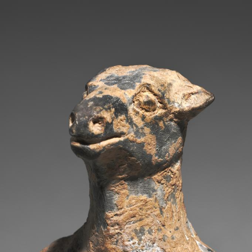 本品规格为22.6厘米。头部为牛首,双耳自然下垂,双目圆睁,眼神温和中透着坚毅,牛鼻宽大,嘴角微微上扬,展现出牛温顺又憨厚的神态,虽历经时光磨损,牛的特征依旧鲜明 。身着宽大长袍,衣纹以简洁流畅的线条刻画,呈现出自然的褶皱与垂坠感,双臂交叉抱于胸前,姿态端庄肃穆,带有北魏时期俑类典型的庄重、守护风格 。