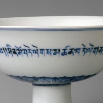 宣德皇帝受其祖父永乐帝影响,对藏传佛教加以扶持,天下太平富裕的局面也为宗教文化的交流提供了良好的环境。青花藏文高足碗可能是宣德皇帝在宫内供佛或者施舍给西藏大法王的珍贵作品,是维系汉藏间赐贡体系的重要实物见证,体现了明朝统治者对西藏地区宗教信仰和文化传统的尊重。宣德时期是青花瓷烧造技术的高峰,有 “诸料悉精,青花最贵” 的赞誉。此时的制瓷工艺精湛,无论是瓷胎的细腻程度、釉面的温润感,还是纹样的清晰度,都达到了前所未有的高度,青花藏文高足碗就是这一时期高超制瓷工艺的杰出代表。