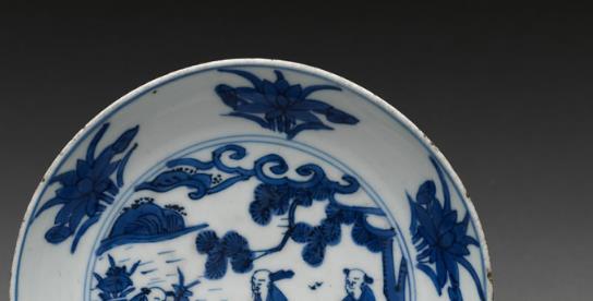般为撇口、弧腹、圈足的经典盘式,造型规整,线条流畅,比例协调,具有明代瓷器端庄稳重的风格。其尺寸大小不一美国大都会博物馆收藏的一件明万历青花周敦颐爱莲图盘,直径约为 11.9 厘米。胎质坚硬细腻,经过精细淘洗,胎体厚重适中。釉面光亮莹润,白中微微泛青,给人以温润之感,展现了万历时期瓷器釉质的特点。