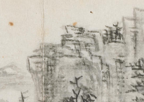 本品规格为6.1 x 7.7 厘米。以水墨绘山水, 近景亭阁临溪, 树木错落; 中景山峦层叠, 云雾轻笼; 远景岫岩悠远, 江面空蒙。 用笔简淡, 以皴擦写山石肌理, 以点线绘草木屋舍, 淡墨晕染间, 营造出 “山亭观远岫, 江阔意无穷” 的清幽意境, 传递清代文人寄情山水的闲适与哲思。