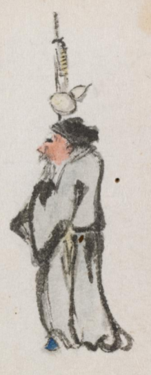 本品规格为6.1 x 7.7 厘米。右侧绘一文人, 头戴奇特饰物(似长杆挑葫芦等 ), 身着宽袍, 面容清瘦、 神态悠然。 笔墨简率写意, 以寥寥数笔勾勒身形, 色彩淡朴(灰袍、 蓝履 ), 却生动刻画出人物的独特气质与随性姿态。左侧行书题诗, 文字率性洒脱, 内容或与人物身份、 奇饰寓意相关, 诗画互衬, 传递出清代文人 “不拘世俗、 自表性情” 的雅趣, 展现曾衍东 “诗画一体、 以笔抒情” 的创作风格。