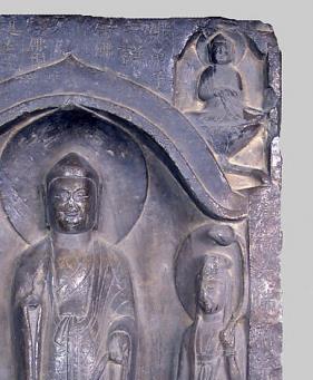 仿品多以北齐佛教造像碑的经典形制为蓝本,通常为长方形碑体(少数为尖首碑或圆首碑),由 “碑首、碑身、碑座” 三部分构成,部分石碑保留碑侧装饰,整体比例趋近北齐原作,但细节处常带晚清民国工艺特征核心区域为 “一佛二菩萨” 造像组合,是仿作的重点。碑身两侧或刻立柱(仿北齐 “火焰纹柱” 或 “忍冬纹柱”),柱间常补刻供养人、飞天或题记(部分题记刻意模仿北齐隶书风格,但笔法生硬,缺乏北齐书法的古朴稚拙)。