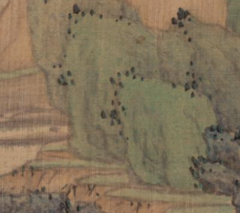 本品规格为12.6 x 17.3 厘米。画面呈现典型的山水布局, 近景、 中景、 远景层次分明。 近景处, 低矮的山丘覆盖着葱郁的绿色植被, 树木丛生, 形态各异, 增添了画面的生机; 中景是开阔的江面, 水面平静, 似能感受到江水的悠悠流淌, 江面上点缀着几叶小舟, 虽小巧却为画面增添了生活气息与灵动之感; 远景中, 巍峨的山崖矗立, 山崖以独特的 “江崖叠翠” 形态呈现, 层叠的绿色与岩石的纹理相互映衬, 展现出雄浑与秀丽兼具的山水之美。