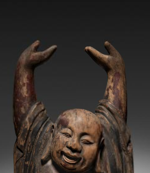 本品规格为68 厘米。以木材为质,历经岁月,包浆古朴厚重。弥勒形象鲜明,袒胸露腹,大肚浑圆,笑容可掬,双颊饱满,神态慈祥喜乐。双臂高举,衣袍垂坠自然,褶皱流畅,尽显工匠对衣饰纹理的细腻把握。整体造型生动,将弥勒佛的豁达、欢喜之态完美呈现,是研究明代木雕艺术、佛教造像文化的珍贵实物,承载明代工匠的技艺与对弥勒形象的诠释 。