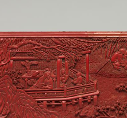 本品规格为48.5 x 21 厘米。这件长方盒呈长方体形状,规整而大气。盒体线条简洁流畅,边角圆润,给人一种端庄稳重之感。这样的形制既方便实用,又符合明代器物造型的审美特点,体现了实用性与美观性的结合。采用剔红工艺制作,这是一种在器物胎体上髹涂多层红漆,待漆层达到一定厚度后,再运用雕刻刀具在漆层上雕刻出图案的技法。此长方盒上的漆层丰厚,雕刻时能够展现出丰富的层次和立体感。通过精细的雕刻,使画面中的人物、景物等形象栩栩如生,充分彰显了明代工匠精湛的技艺水平。