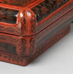 通常为木胎,多呈倭角(委角)方形,即直角变为内凹的双弧线或圆角,有平顶弧沿、直壁,子母口设计,部分配有圈足,造型规整且端庄大方。如青岛市博物馆藏明万历戗金彩漆双龙戏珠纹倭角方盒,口径 18×18 厘米、高 9 厘米。