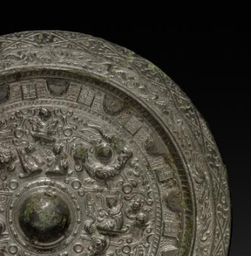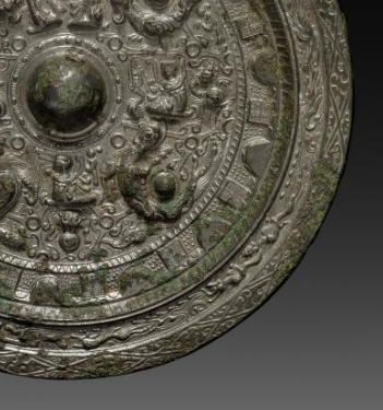 本品直径为18.5厘米。圆形,中央设半球形钮(用于穿绳持握 ),以青铜铸造,历经岁月氧化,表面呈现古朴绿锈与包浆,尽显历史厚重感。中心钮区:钮座简洁,围绕钮部是神兽、瑞兽主题纹饰,能辨识龙、虎等神兽,形态或奔走、或盘踞,细节刻画生动(如鳞片、肢体肌肉 );还穿插羽人、小兽等,营造 “神兽世界” 氛围。外围辅助纹:设几何纹、云气纹等装饰带,与主纹呼应,丰富视觉层次,体现南北朝铜镜 “满而不乱” 的纹饰设计逻辑。