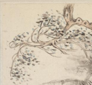 本品规格为11.2 x 13.1 厘米。绘两位文人,一着白衣、一着粉衣,相对而坐于树下。白衣者似聆听,粉衣者正抚琴(琴置于身前 ),姿态闲适,传递 “琴瑟和鸣” 的雅集氛围。以简笔勾勒山石、树木 —— 老树虬枝横斜,枝叶点染淡蓝,增添清逸感;下方坡石、丛草点缀,营造 “林下幽境”,呼应 “山林隐居” 主题。