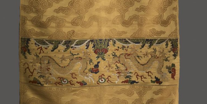 本品规格为373.4 x 71.1 厘米。整体以金黄为底色,满铺云纹,似在营造祥瑞氛围。三条饰带横向分布,其上织就龙纹,龙身灵动,或腾或跃,辅以色彩点缀,与云纹底色相衬,华丽且庄重。