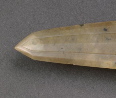 本品规格为4.4厘米。 长条形,前端为尖锐援部(似利刃 ),后端设阑(凸起棱线 )与内(安装柄部的部分 ),内上有穿(圆形孔,用于捆缚固定 ),符合商代玉戈 “援 - 阑 - 内” 的经典结构,是权力与礼仪的象征(非实战兵器,属礼器 )。 青玉质地,受沁呈斑驳色(灰、褐沁斑 ),表面打磨光滑;援部起脊线,阑部雕刻兽面纹(简化的眼睛、鼻梁,用阴刻线勾勒 ),线条刚劲,体现商代 “以纹为尊” 的玉器装饰风格,虽简约却威严庄重。